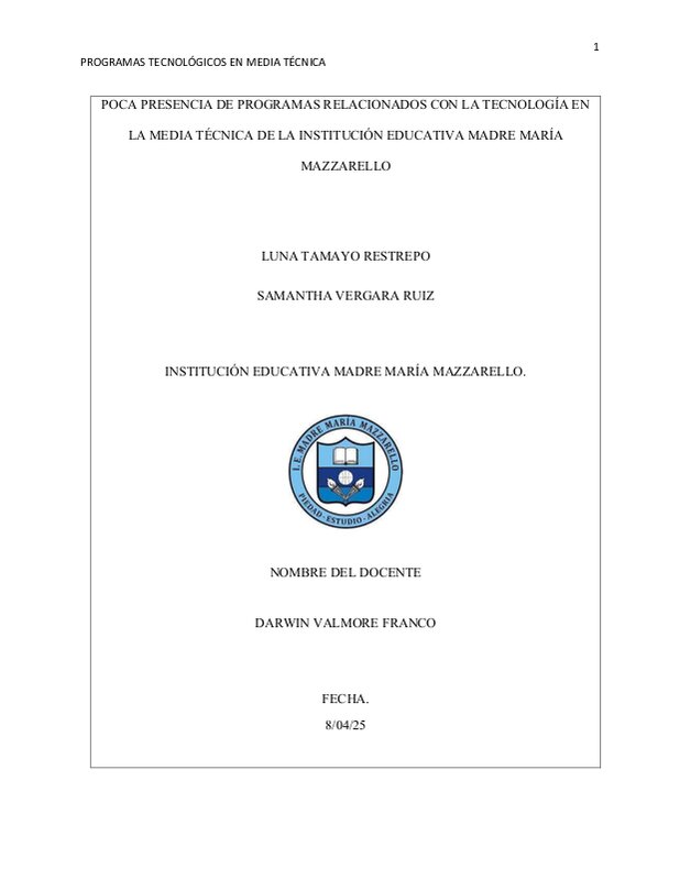 Poca Presencia De Programas Relacionados Con La Tecnología En La Media Técnica De La Institución Educativa Madre María Mazzarello. Por Luna Tamayo Restrepo Y Samantha Vergara Ruiz.