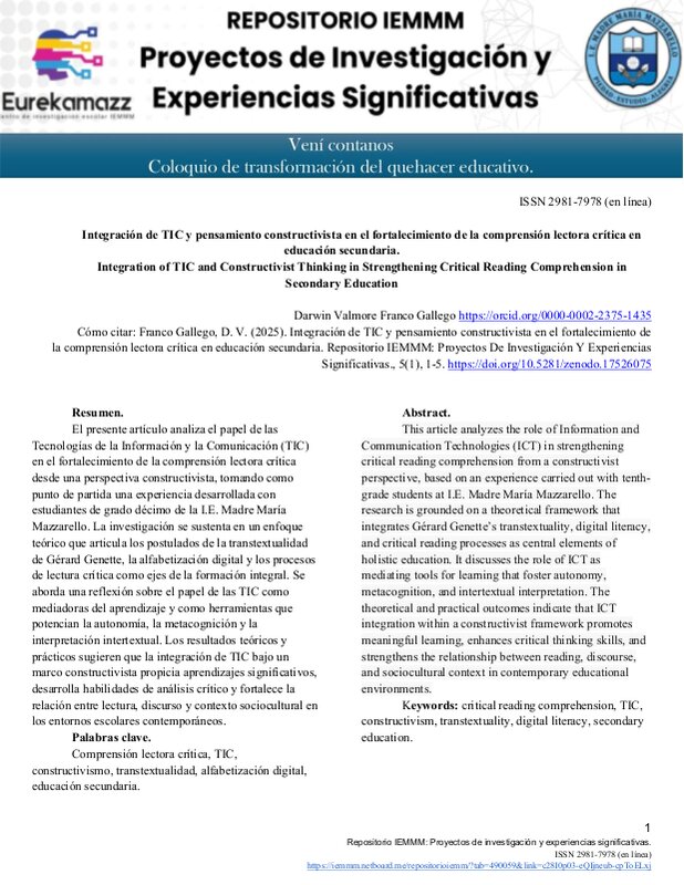 Integración De Tic Y Pensamiento Constructivista En El Fortalecimiento De La Comprensión Lectora Crítica En Educación Secundaria